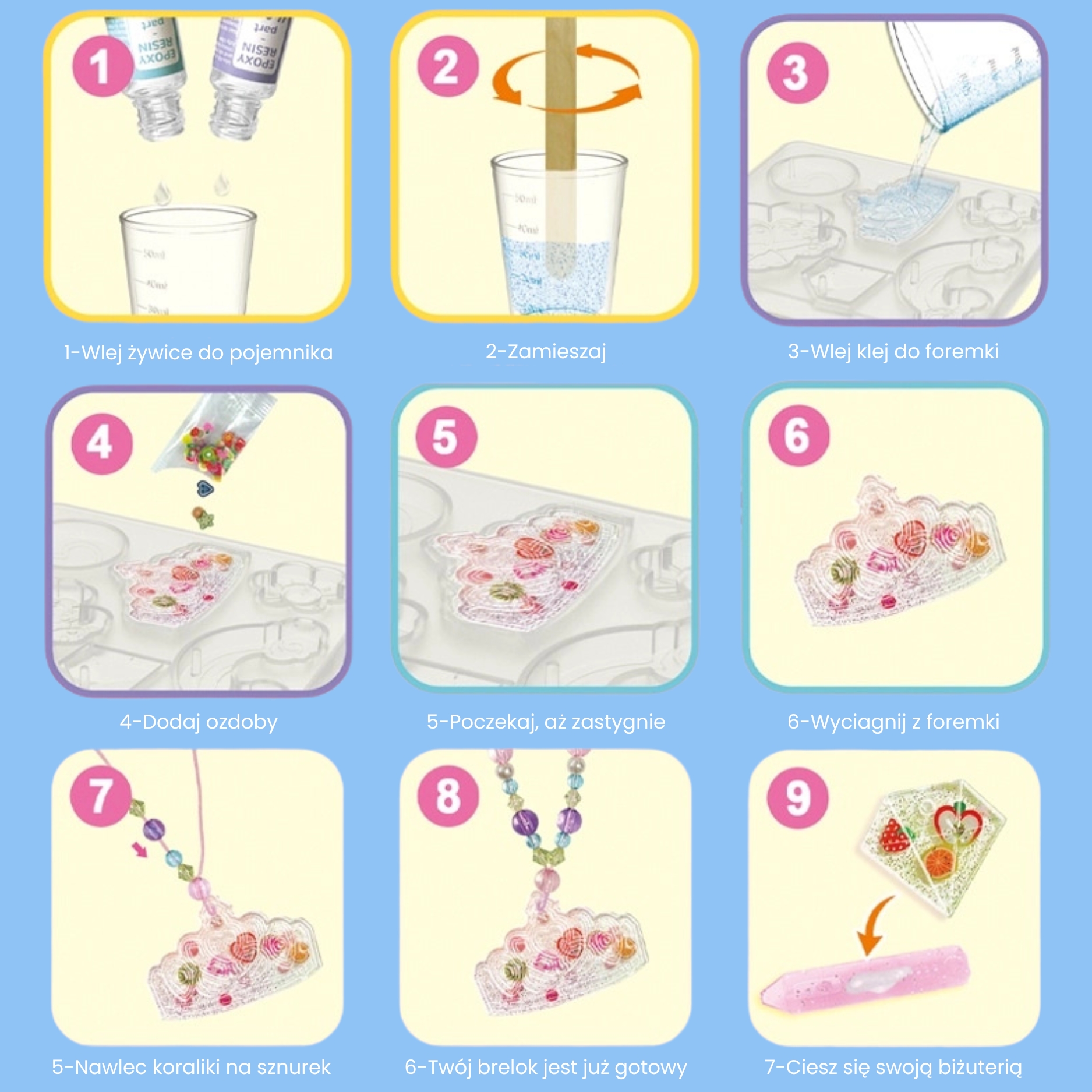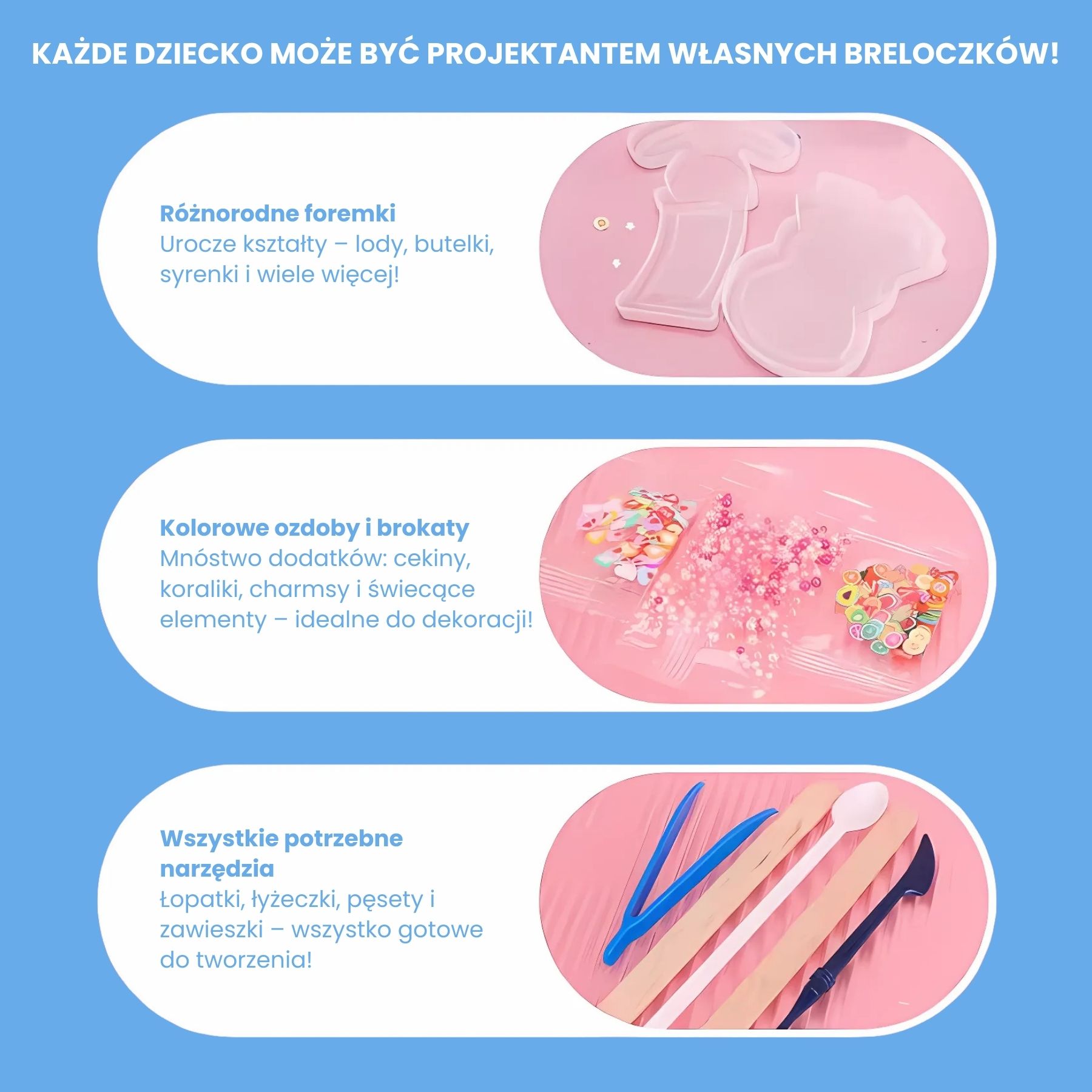 Dzięki szybkoschnącej żywicy epoksydowej i bogatemu zestawowi brokatów oraz ozdób, z łatwością stworzysz błyszczące breloczki, które zachwycą kolorem i kształtem.